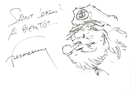 Vous savez ce qui me peine le plus, tous les gars ? C'est de lire sur le forum BDGest le témoignage de tzynn qui raconte que voilà un mois il a assisté à une séance de dédicace d'Hermann et que, s'est-il laissé dire, c'était la dernière fois qu'Hermann dessinait. Quand on sait combien Yves nous a expliqué à quel point son père tenait à cette discipline, ça me peine de penser que pendant tout un mois il n'aura plus pu y donner cours... 😑